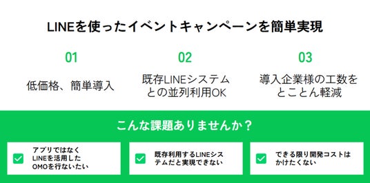 しかし、従来のLINEシステムでは体験型イベントのキャンペーン管理の実現が難しく、また、新たなアプリ開発には高額なコストがかかるという課題がありました。