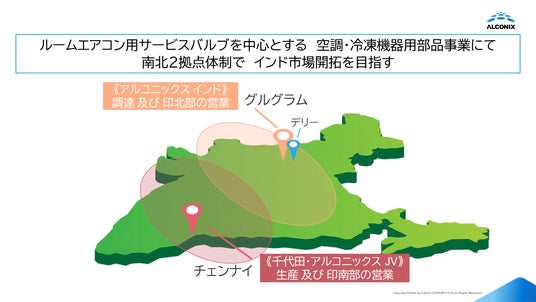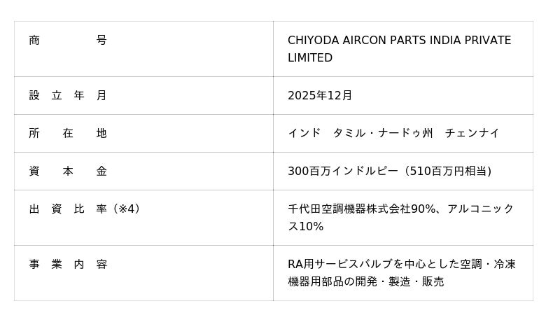 アルコニックス株式会社(東京都千代田区、代表取締役 社長執行役員CEO:手代木 洋、以下、アルコニックス)は、アルコニックスグループのインドにおける事業展開の加速に向け、現地法人の設立並びに、空調・冷凍機器の機能部品の開発・設計・製造大手である千代田空調機器株式会社(代表取締役社長:北山 貴靖)と連携して家庭用空調機(ルームエアコン、以下、RA)用サービスバルブを中心とした空調・冷凍機器用部品の開発・製造・販売をインド現地にて行う合弁会社の設立を決定しました。