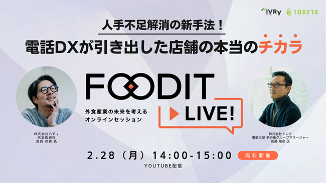 IVRyとトレタは、FOODIT TOKYO実行委員会主催の飲食店関係者を対象としたオンラインセミナー「FOODIT LIVE!」に登壇します。「人手不足解消の新手法! 電話DXが引き出した店舗の本当のチカラ」と題し、電話DXの現在や効果的な活用事例の紹介、飲食店における電話DXの未来について議論を深めます。