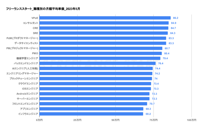 具体的な月額平均単価は1位「VPoE」が86.2万円(前月比+1.2万円・1.41%増)、2位「コンサルタント」が84.9万円(同-1千円・0.12%減)、3位「CRE」が84.7万円(同-5千円・0.59%減)でした。