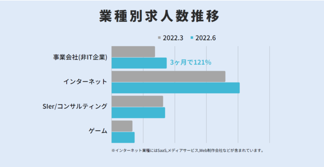 2022年3月と2022年6月の求人数を比較すると、全体の求人増加率は113%であるのに対し、非IT系の事業会社の求人増加率が121%と最も増加しています。