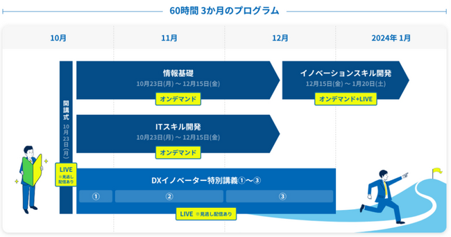 10月23日(月)に開講式を実施し、カリキュラムがスタートします。本プログラムは3つのカリキュラムをメインとしています。オンデマンド中心の「情報基礎」「ITスキル開発」は10月23日(月)~12月15日(金)にて順次開講します。12月15日(金)~1月20日(土)は、オンデマンド+オンラインリアルタイム(LIVE)講義となる「イノベーションスキル開発」による実践的なアウトプットを行います。さらに、月に1回、最先端のイノベーションを実践している外部講師による「DXイノベーター特別講義」を実施します。