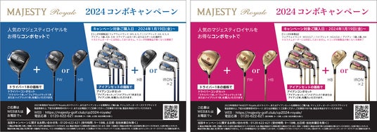 マジェスティ ゴルフ株式会社(東京都千代田区 代表取締役CEO 塚元 俊輔)は、人気モデルの 「マジェスティ ロイヤルシリーズ」 メンズ・レディスクラブを対象とした「2024 コンボキャンペーン」を、2024 年1 月19 日(金)より実施いたします。「2024 コンボキャンペーン」は、ドライバー1 本ご購入で同シリーズのフェアウェイウッドまたはハイブリッドが1 本、アイアンセットご購入でハイブリッド1 本またはアイアン2 本がついてくるお得なセットキャンペーンです。対象製品をご購入後、マジェスティ オーナーズクラブサイトで製品登録の上、お電話もしくはWEB サイトからご応募いただけます。マジェスティの人気モデルを同時に複数本、手に入れることができる大変お得なキャンペーンです。ぜひ、今年のゴルフも、美しさとテクノロジーを結集したマジェスティのクラブでお楽しみください。