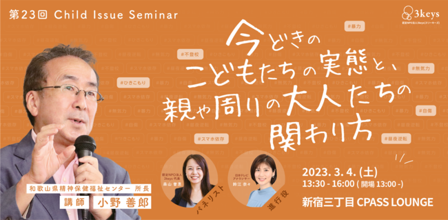23回目となる今回の「Child Issue Seminar」は、「自立前の不安定な時期=思春期」にスポットをあてます。長年にわたり「思春期」と向き合ってこられた子どもの心の専門医小野善郎さんよりご講演をいただき、3keys代表・森山から活動を通して見えてきた日本の子どもたちの現状などについてお伝えしたのち、二人によるトークセッションをお送りします。司会進行は二児の母であり当団体の活動のよき理解者でもある日本テレビ鈴江奈々アナウンサーにご協力いただきます。