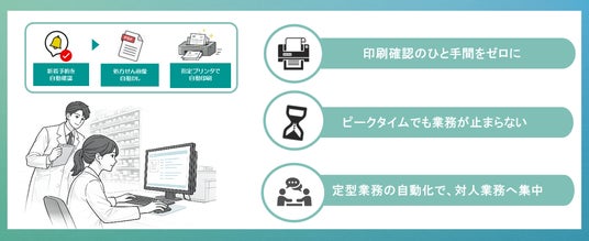 今回追加された「処方せん自動印刷機能」は、この受付後の業務処理を自動化することで、調剤予約をより効率的に活用できる環境を整えるものです。