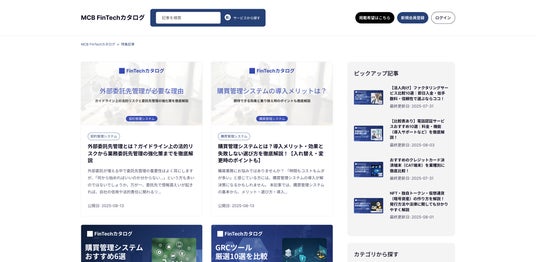 マネックスクリプトバンク株式会社(本社:東京都港区、代表:万代惇史、以下「マネックスクリプトバンク」)は、web3領域に特化していた資料請求サイト「MCB Web3カタログ」を全面的にリニューアルし、お金・金融領域の法人向けサービスを課題別に比較検討できる資料請求サイト「MCB FinTechカタログ」として公開いたしました。これに合わせて、掲載企業向けの料金プランを月額固定費なしの完全成果報酬型へ移行し、スタートアップ向けの特別プランも提供します。