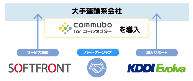 株式会社ソフトフロントホールディングス(本社:東京都千代田区、代表取締役社長:二通宏久)の子会社である株式会社ソフトフロントジャパン(本社:東京都千代田区、代表取締役社長:高須英司、以下 ソフトフロントジャパン)と、株式会社KDDIエボルバ(本社:東京都新宿区、代表取締役社長:若槻肇、以下 KDDIエボルバ)は、ボイスボット「commubo(コミュボ)」の販売代理店契約に基づき、大手運輸系会社のITサポート窓口への「commubo」導入を決定いたしました。