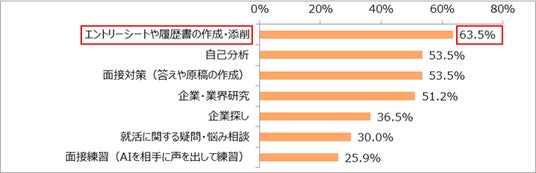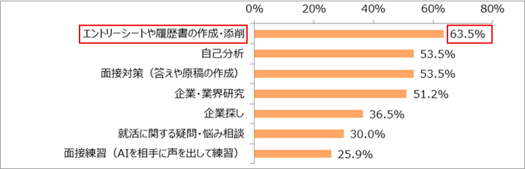 「エントリーシートや履歴書の作成・添削」(63.5%)が最多となり、次いで、「自己分析」(53.5%)、「面接対策(答えや原稿の作成)」(53.5%)、「企業・業界研究」(51.2%)がほぼ同率でした。