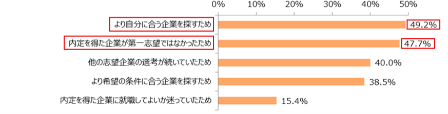 「より自分に合う企業を探すため」(49.2%)と「内定を得た企業が第一志望ではなかったため」(47.7%)がともに約半数となりました。