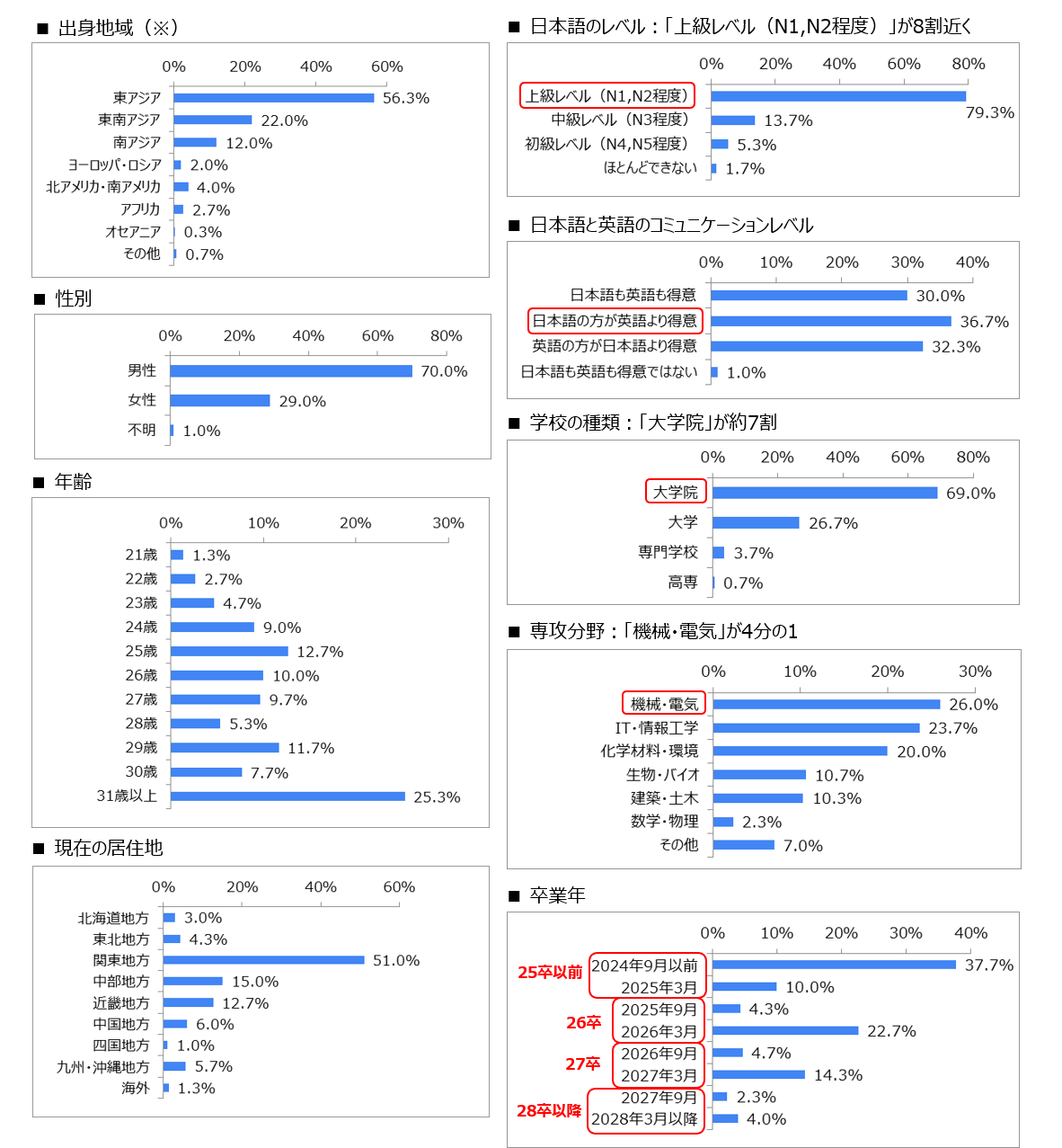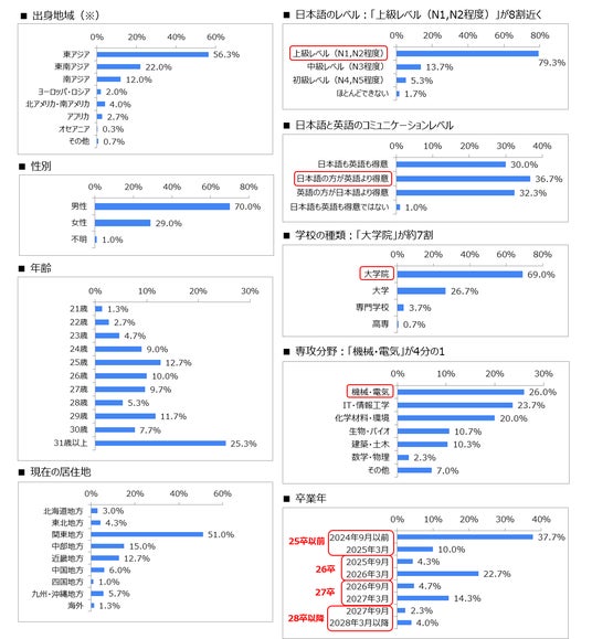 【回答者の属性】 『リュウカツ』登録者の特長である、高学歴で日本語レベルが高い理系留学生が多数