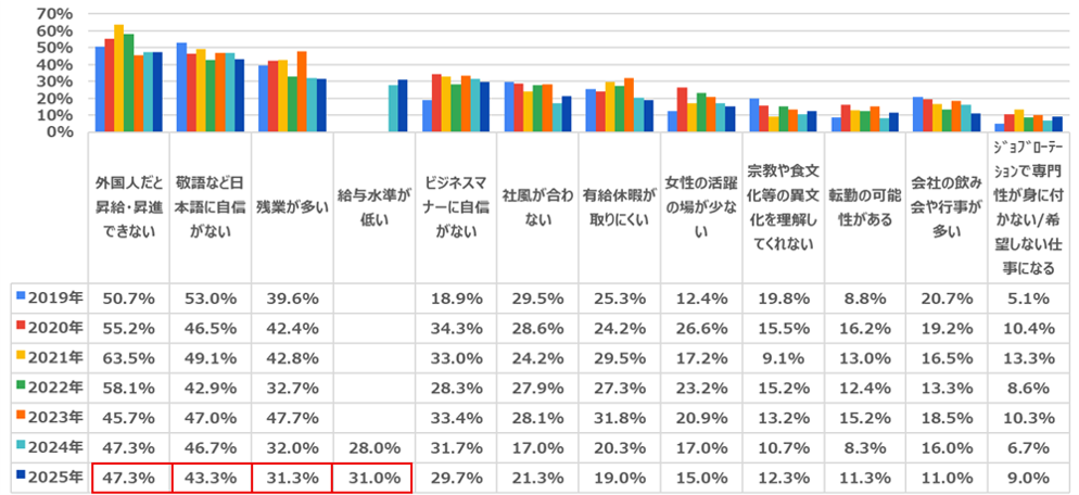 半数近く(47.3%)が「外国人だと昇給・昇進できない」と回答。次いで「敬語など日本語に自信がない」(43.3%)、そしてほぼ同率で「残業が多い」(31.3%)、「給与水準が低い」(31.0%)という結果になりました。