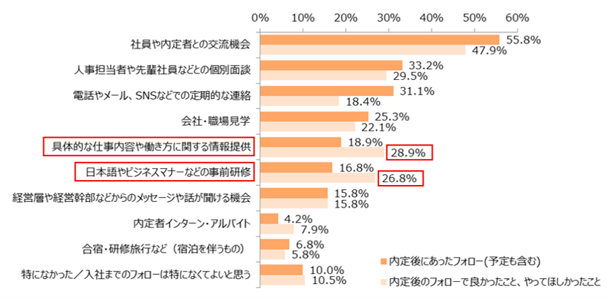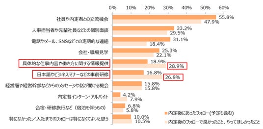 内定後のフォローで良かったこと、やってほしかったことも同時に聞いた結果、「社員や内定者との交流機会」(47.9%)、「人事担当者や先輩社員などとの個別面談」(29.5%)、「具体的な仕事内容や働き方に関する情報提供」(28.9%)、「日本語やビジネスマナーなどの事前研修」(26.8%)となりました。