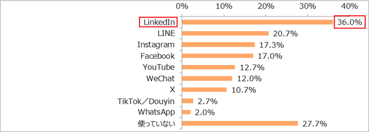 「LinkedIn」(36.0%)が最も多く、4割近くが回答。「LINE」(20.7%)、「Instagram」(17.3%)、「Facebook」(17.0%)も約2割となりました。その一方で、SNSを「使っていない」と回答した留学生も約3割(27.7%)いることがわかりました。