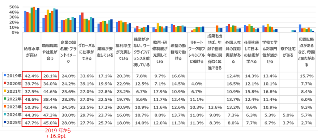 「給与水準が高い」は、2019年からの7回中5回で1位となっていますが、2位の「職場環境や社風が合う」は2019年の28.1%から16.9ptもアップしており、重視する留学生が増加していることがわかります。