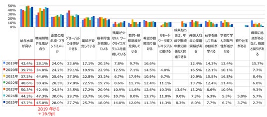 1位「給与水準が高い」(47.7%)、2位「職場環境や社風が合う」(45.0%)、3位「企業の知名度・ブランドイメージ」(28.0%)となりました。