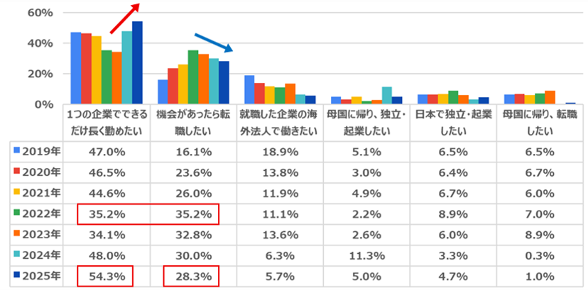 「1つの企業でできるだけ長く勤めたい」(54.3%)は2019年から7年間連続で1位ですが、今回初めて5割を超えました。一方2位の「機会があったら転職したい」は2022年には35.2%で「1つの企業でできるだけ長く勤めたい」と同率1位となっていましたが、その後は緩やかに減少し、今回28.3%となりました。