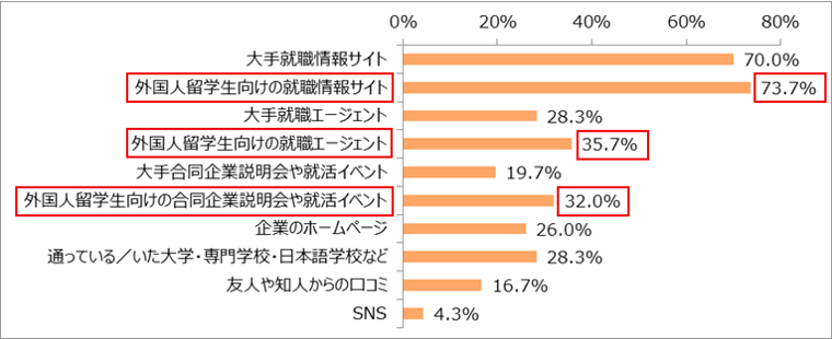 「外国人留学生向けの就職情報サイト」(73.7%)、「大手就職情報サイト」(70.0%)がともに7割を超えました。なお、就職情報サイト、就職エージェント、合同企業説明会や就活イベントは、どれも“外国人留学生向け”が高い割合となりました。