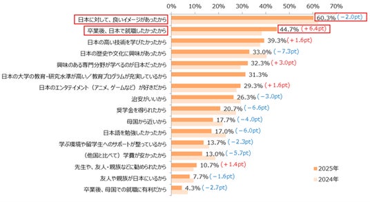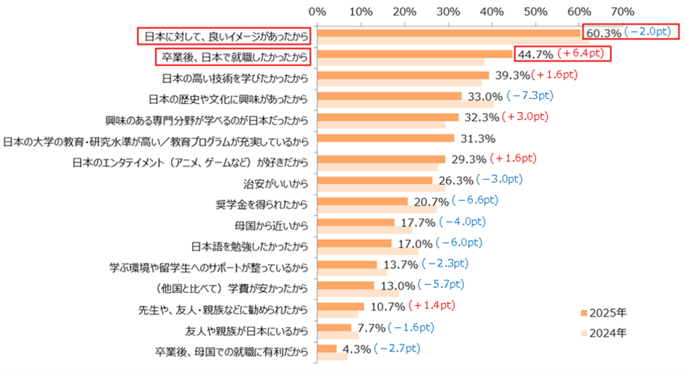 ● 日本に留学した理由、2位の「卒業後、日本で就職したかった」が前年比6.4pt増の44.7%に