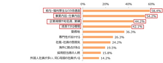 1位「給与・福利厚生などの待遇面」(58.4%)、2位「事業内容・仕事内容」(54.2%)、3位「企業規模や知名度、業績」(44.2%)という結果になりました。また、4位「成長できる環境」も4割(42.1%)を超え、留学生の成長意欲の高さがうかがえます。