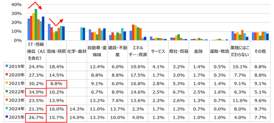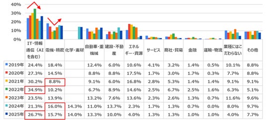 1位「IT・情報通信(AIを含む)」(26.7%)、2位「電機・精密」(15.7%)、3位「化学・素材」(14.0%)となりました。