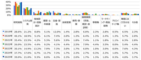1位「研究開発」(39.0%)、2位「システム開発」(21.0%)、3位「機械設計・回路設計」(9.3%)となりました。1位の「研究開発」が2019年から変わらず人気の理由は、回答者の多くが大学院生※であることが考えられます。