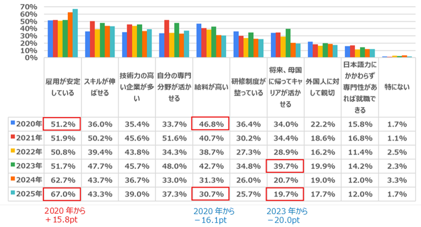 2020年に約5割(46.8%)だった「給料が高い」は16.1pt減少しました。また、「将来、母国に帰ってキャリアが活かせる」も2023年の39.7%をピークに減少しています。