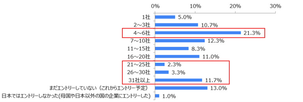 最も多かったのが「4~6社」(21.3%)でした。また、21社以上と回答したのが17.3%(2.3%+3.3%+11.7%)となり、約2割の留学生が日本人学生と同様に多くの企業にエントリーしたことがわかりました。