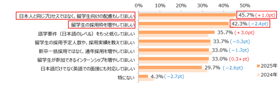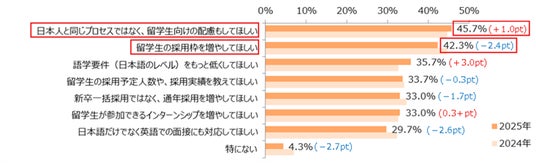 「日本人と同じプロセスではなく、留学生向けの配慮もしてほしい」(45.7%)と「留学生の採用枠を増やしてほしい」(42.3%)が昨年と同様に4割を超えました。