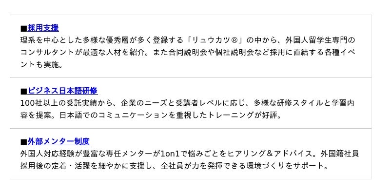 今回のアンケート結果によって見えてきた、留学生の安定志向やキャリア観の変化など最新の動向を踏まえると、今後の留学生採用で成果を出すには、選考段階から入社後まで一貫したサポートが欠かせません。弊社では、留学生採用に課題を感じている企業様向けに、留学生採用・定着を支援するためのサービスをご提供しています。