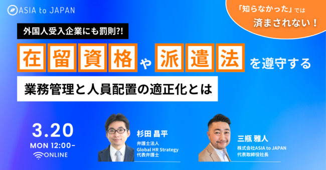 海外の主要大学と提携した大学内での日本語学習などを通じ日本への就職のきっかけを学生に提供する、株式会社ASIA to JAPAN(代表:三瓶 雅人 本社:東京都台東区 以下:ASIA to JAPAN)は、在留資格や派遣法を遵守する業務管理と人員配置の適正化について、3月20(月)にウェビナーを実施いたします。