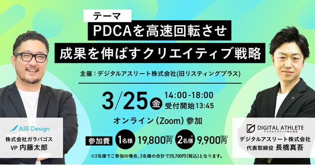 デジタルアスリート株式会社が主催するセミナー「PDCAを高速回転させ成果を伸ばすクリエイティブ戦略」に、株式会社ガラパゴス AIR Design for Marketing事業部 VP(ヴァイスプレジデント)内藤 太郎が登壇いたします。