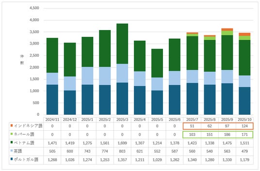 出入国在留管理庁によると、2025年7月末時点での在留外国人は約396万人と過去最多で、前年末と比べ増加人数の多い国籍をみると、ネパール人は約4万人、インドネシア人は約3万人、次いでミャンマー人は約2万6,000人増加しており、今後、ビレッジハウスへもミャンマー人の問い合わせ拡大が予想されることから、ミャンマー語の対応を開始しました。