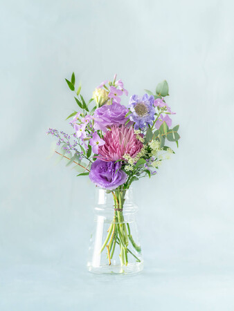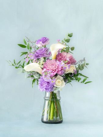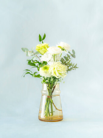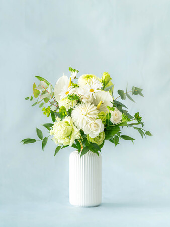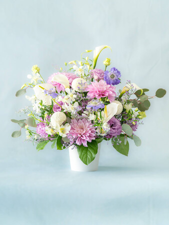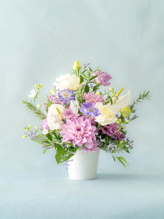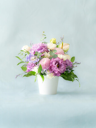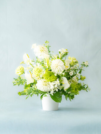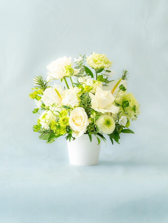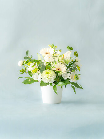 アンドプランツでは、命日、お通夜、葬儀、初七日などに適した、白を基調としたお供え花と、四十九日以降、一回忌、三回忌などにご利用いただける、パープルを中心に色味を取り入れたお供え花の2パターンをご用意。存在感のある菊のほか、バラなどの洋花も用いて、明るく華やかに仕上げました。「お供え用・おまかせブーケ S(3,300円)」「お供え用・おまかせブーケ M(5,980円)」「お供え用・おまかせアレンジ S(4,980円)」「お供え用・おまかせアレンジ M(6,980円)」「お供え用・おまかせアレンジ L(9,980円)」の5商品、それぞれホワイトとパープルの2色展開で、全10種のラインナップにて販売いたします。