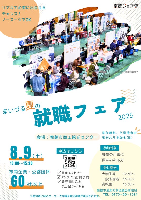 令和7年8月9日(土)に舞鶴市商工観光センターにて、市内60社以上の企業等が集う合同企業説明会「まいづる夏の就職フェア」を開催します。