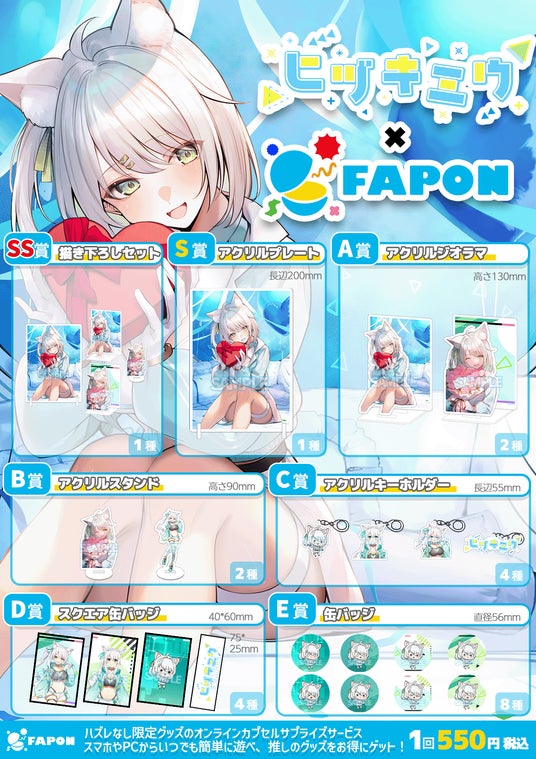 FAPON |ハズレなし限定グッズのオンラインカプセルサプライズサービスFAPON(ファポン)はVTuber事務所WACTORが提供するオンラインカプセルサプライズサービスです。スマホやPCからいつでも簡単に遊べ、ハズレなしで限定グッズをお得にゲット!有名VTuber・インフルエンサー・IPとタイアップしたオリジナル商品も続々登場予定です!