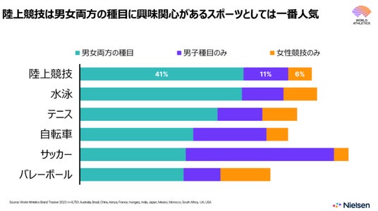 ニールセンの調査によると世界におけるスポーツの興味関心度で、陸上競技は、サッカー、ジョギング、水泳に次いで第4位。陸上競技は男女両方の種目に関心のあるスポーツとして第1位となっている。また、ブダペスト2023世界陸上競技選手権大会の観客の77%が、陸上競技にもっと頻繁に参加したいと回答、これは2022年オレゴン大会の調査41%から飛躍的に増加している。さらに、ブダペスト大会では、経済、メディア、社会、環境、観客動員の指標において総額4億800万USドル(約594億円)の経済効果をもたらした。