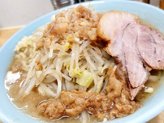 ラーメン激戦区・神保町で行列が絶えない二郎系ラーメン店。豚骨の背ガラやゲンコツを継ぎ足しながら煮込んでマイルドかつクリーミーに仕上げる豚骨醤油味のスープと、食べ応えたっぷりの太麺が特徴。数々の人気店を輩出した、東京屈指の超有名店です。