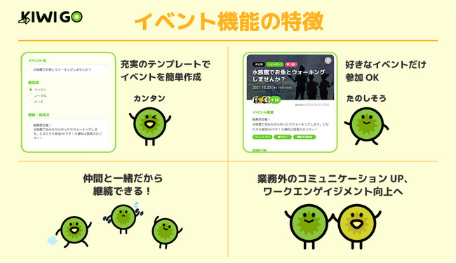 株式会社アジャイルウェア(本社:大阪市中央区、代表取締役CEO:川端 光義)が運営する、楽しく少しずつ従業員の運動を促し習慣化できる福利厚生ヘルスケアサービス「KIWI GO」は、誰でも自由に社内イベントを企画・運営できる「イベント機能」をリリースいたしました。