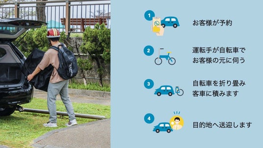 当サービスは以下の通り、一般的な運転代行と異なり、運転手が自転車等の移動手段でお客様のもとに伺い、その車両を折り畳みお客様の車両に積み込む形でサービスを提供します。