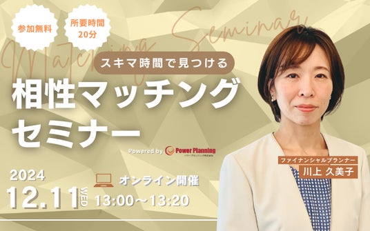 無料マネーセミナー提供サービス「アットセミナー」を運営しているパワープランニング株式会社が「12月11日(水)13時」に「相性マッチングセミナー」というスキマ時間で自分に合ったFPを見つけられるオンラインセミナーを開催いたします。