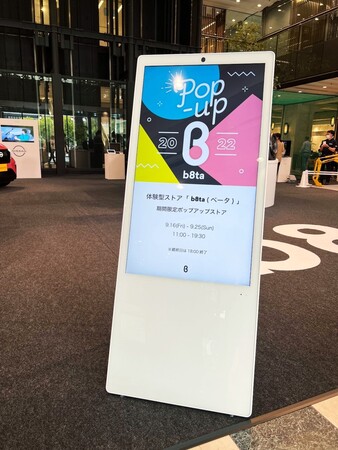出品商品の紹介動画を、営業時間中ループで再生。人の流れが多く視認性の高い場所への出店のため、デジタルサイネージをきっかけに来店を促す仕組みです。また、立ち止まってb8taを体験いただく時間がない方にも効果的に商品やストアを知っていただくことにも繋がります。