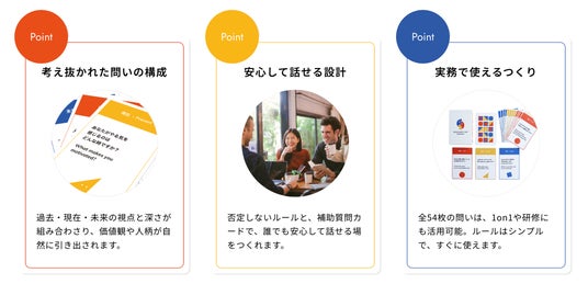 全54枚の問いカードを用いて、1on1やチームビルディング、研修や朝会などの場で活用可能。表面的な雑談にとどまらず、価値観や経験にふれる“深い対話”を自然に引き出し、組織の信頼関係や多様性を尊重する文化づくりをサポートします。発売から2ヶ月間は、20%OFFの特別価格(1,584円/税込)で提供します。