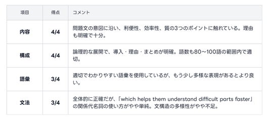 (3)Writing:公式4観点(内容/構成/語彙/文法)で内訳表示
