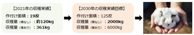 「国産綿復活プロジェクト」は、日本の綿自給率1%を目指しています。また、2030年までに、本プロジェクトにて生まれた綿をプリスティンの製品に2%(2トンの収穫量)入れ込むことを目標としています。