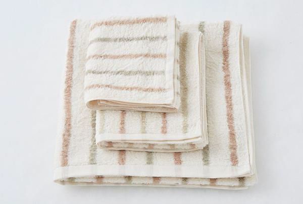 ブランドがはじまった当初からお作りしている「ストライプタオル」は三色の糸を使っています。この【ナチュラル・ブラウン・グリーン】は実はコットンそのままの色を生かしたものです。そんな「原綿を生かしたものづくり」への想いを込めたストライプタオル。