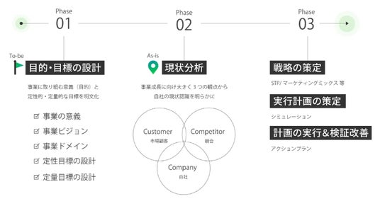事業の目指すべき姿や目標の設計、市場環境分析(市場顧客・競合・自社)を通して、事業成長の実現に向けた具体的な戦略の計画と実行を一貫して支援