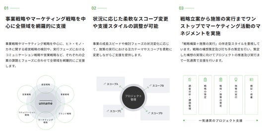 マーケティングの側面から、企業の事業成長と生産性向上を支援する株式会社unname(本社:東京都渋谷区、代表取締役:宮脇 啓輔、以下「unname」)は、事業計画やマーケティング戦略の設計を通して事業成長を支援する「事業戦略の策定支援」の提供を開始したことをお知らせ致します。