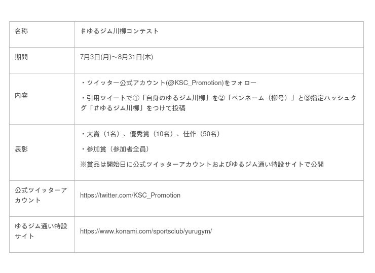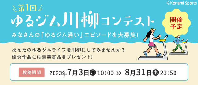 コナミスポーツ株式会社が運営する「コナミスポーツクラブ」は、「あなたの思う『ゆるジム通い』」を詠む「ゆるジム川柳」を募集するツイッターキャンペーンを開催します。大賞・優秀賞・佳作を発表し、賞品をプレゼントするほか、参加賞も用意します。