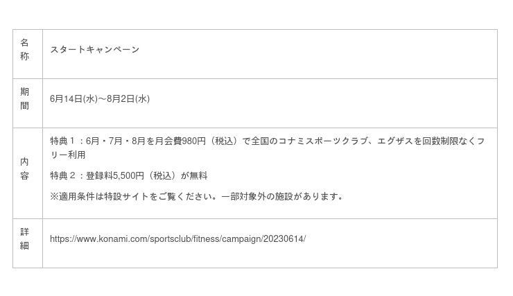 コナミスポーツクラブのフィットネスでは、「ゆるジム川柳」のほかにも、お得にフィットネスライフを始められる「スタートキャンペーン」を実施しています。