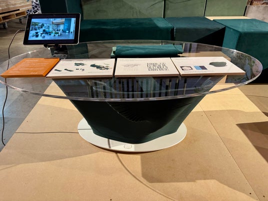BOLDGYMメンバーと一緒に製作された合成皮革の廃棄物を材料にしたテーブル(株式会社博展)
